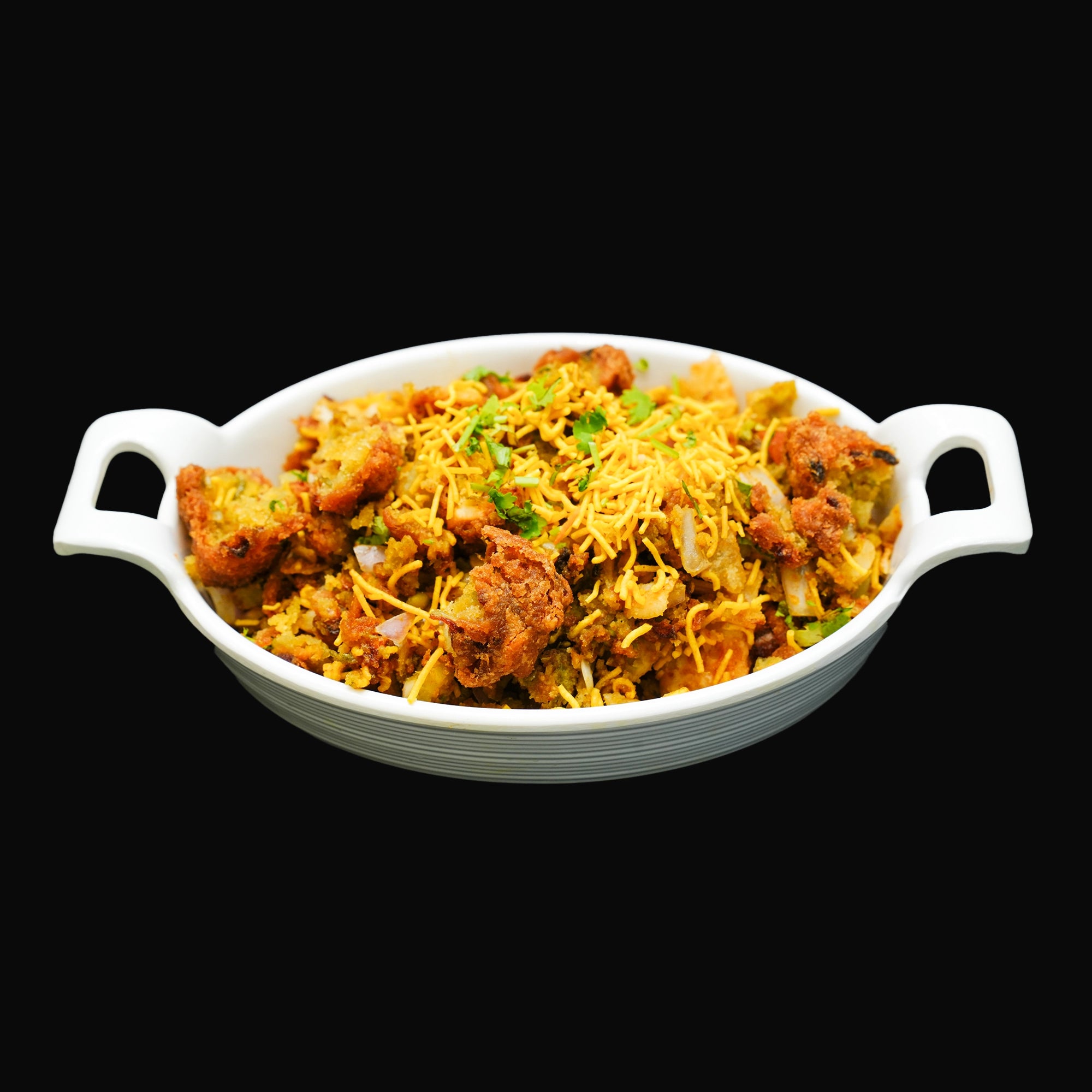 A light and crunchy mix of puffed rice, chopped onions, tomatoes, green chilies, and tangy chutneys.