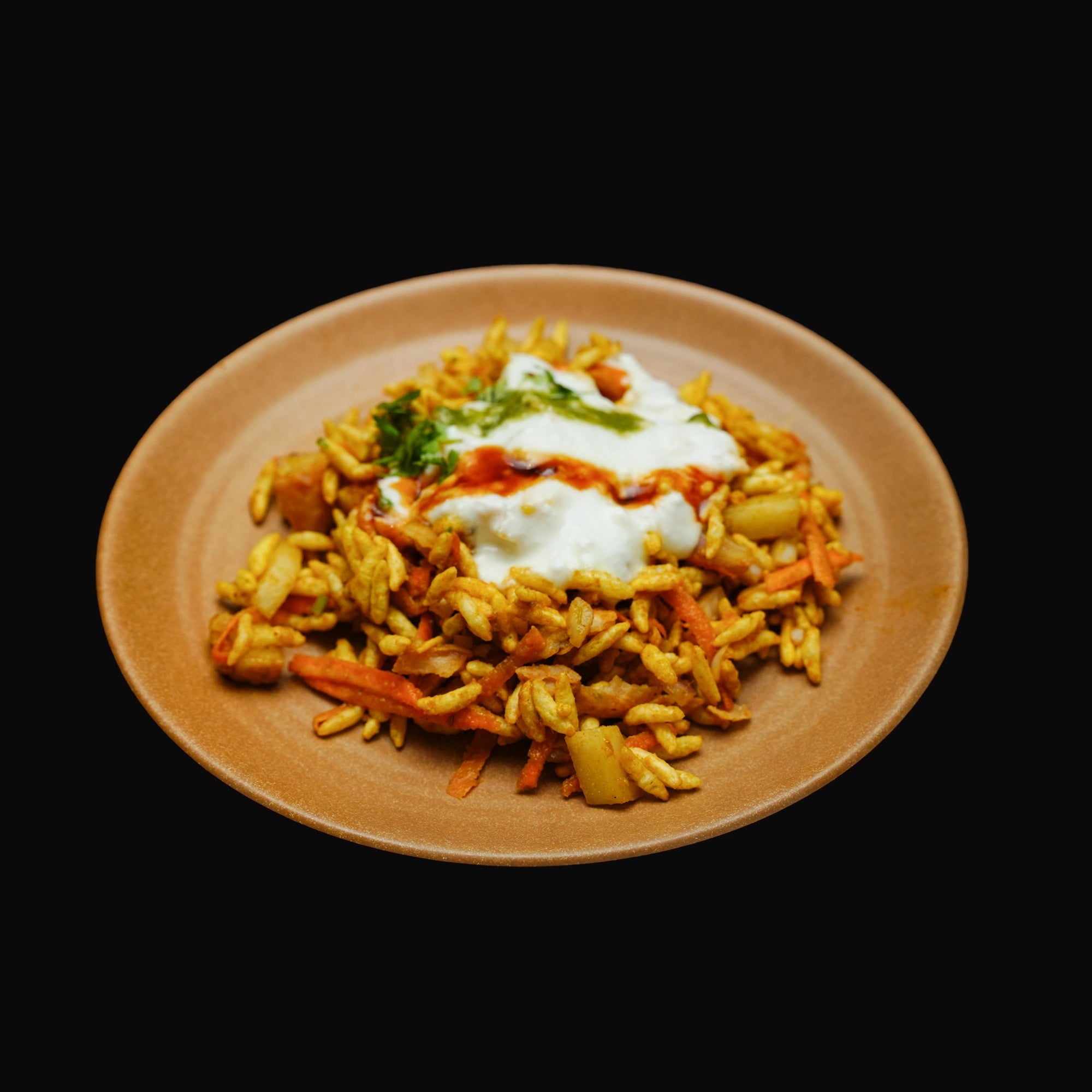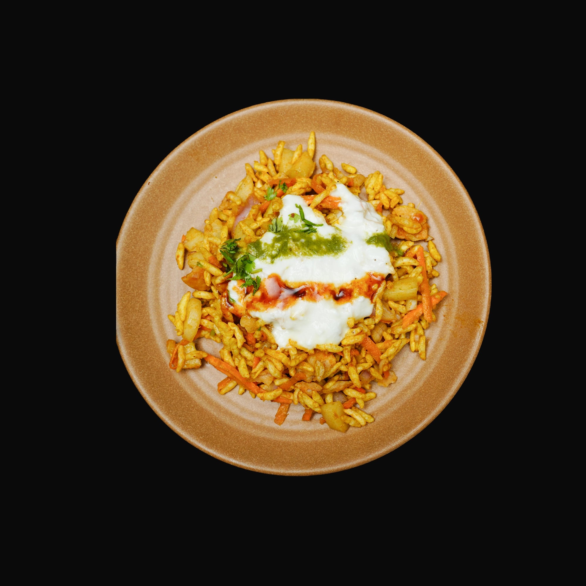 A creamy and crunchy mix of puffed rice, sev, chutneys, and fresh veggies, topped with smooth yogurt.