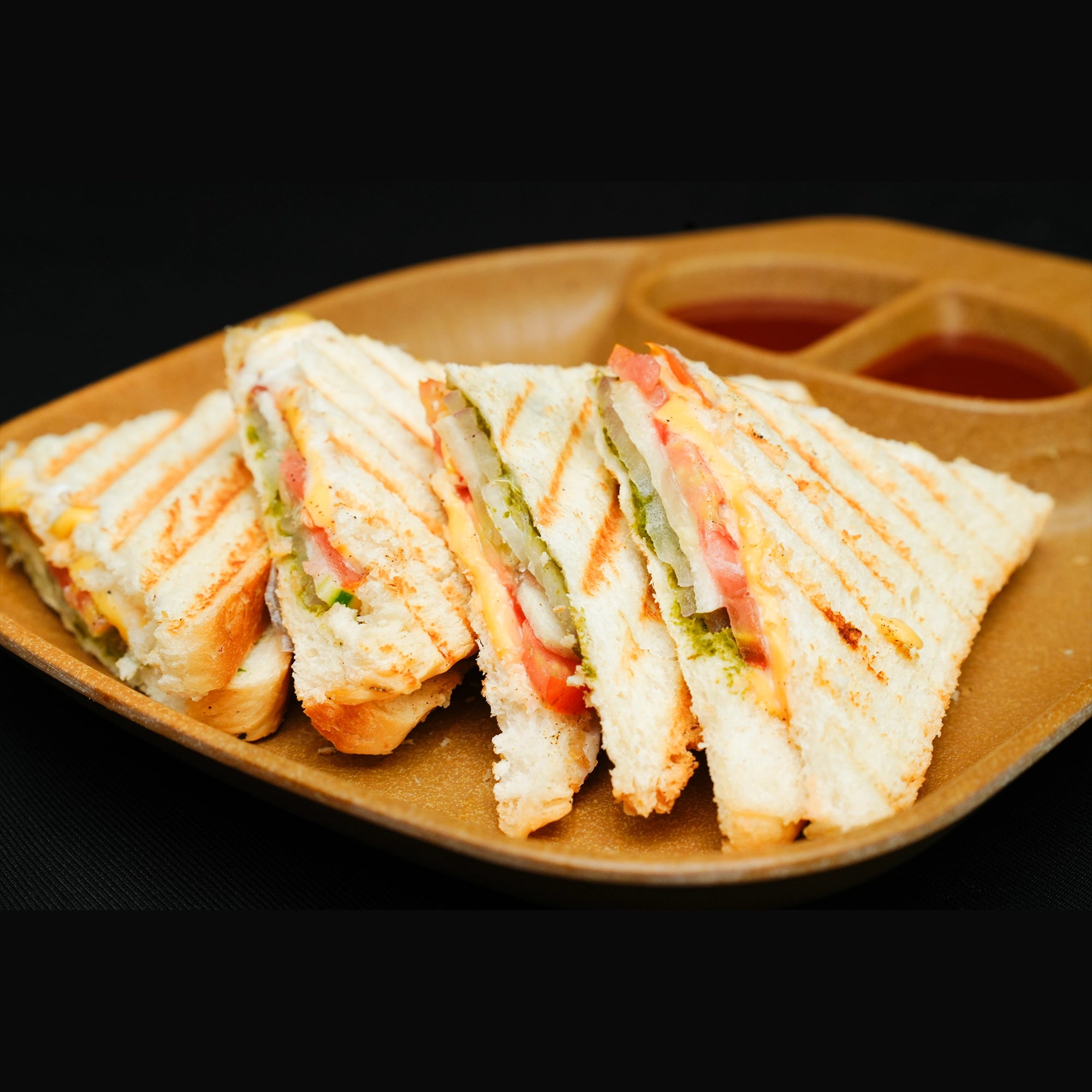 A wholesome mix of fresh vegetables layered between soft bread slices, with a touch of butter and flavorful chutneys. Light, crunchy, and perfect for a quick, tasty bite.